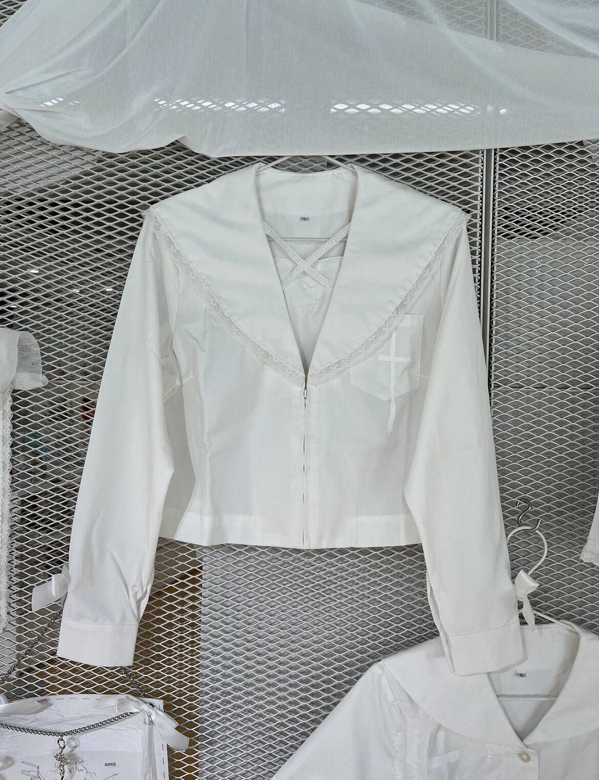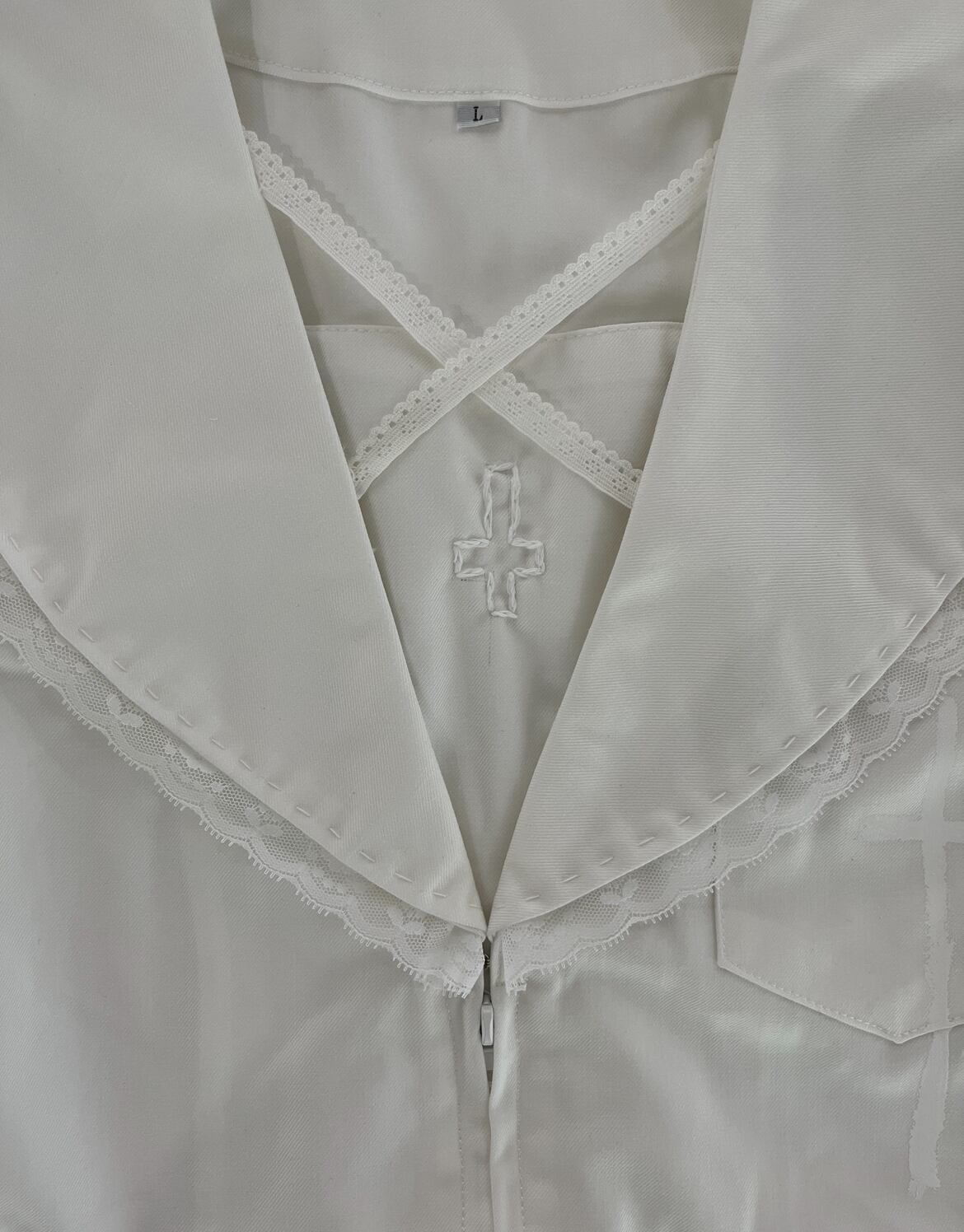 胸元のクロスされたリボン、刺繍の十字架が可愛いです.