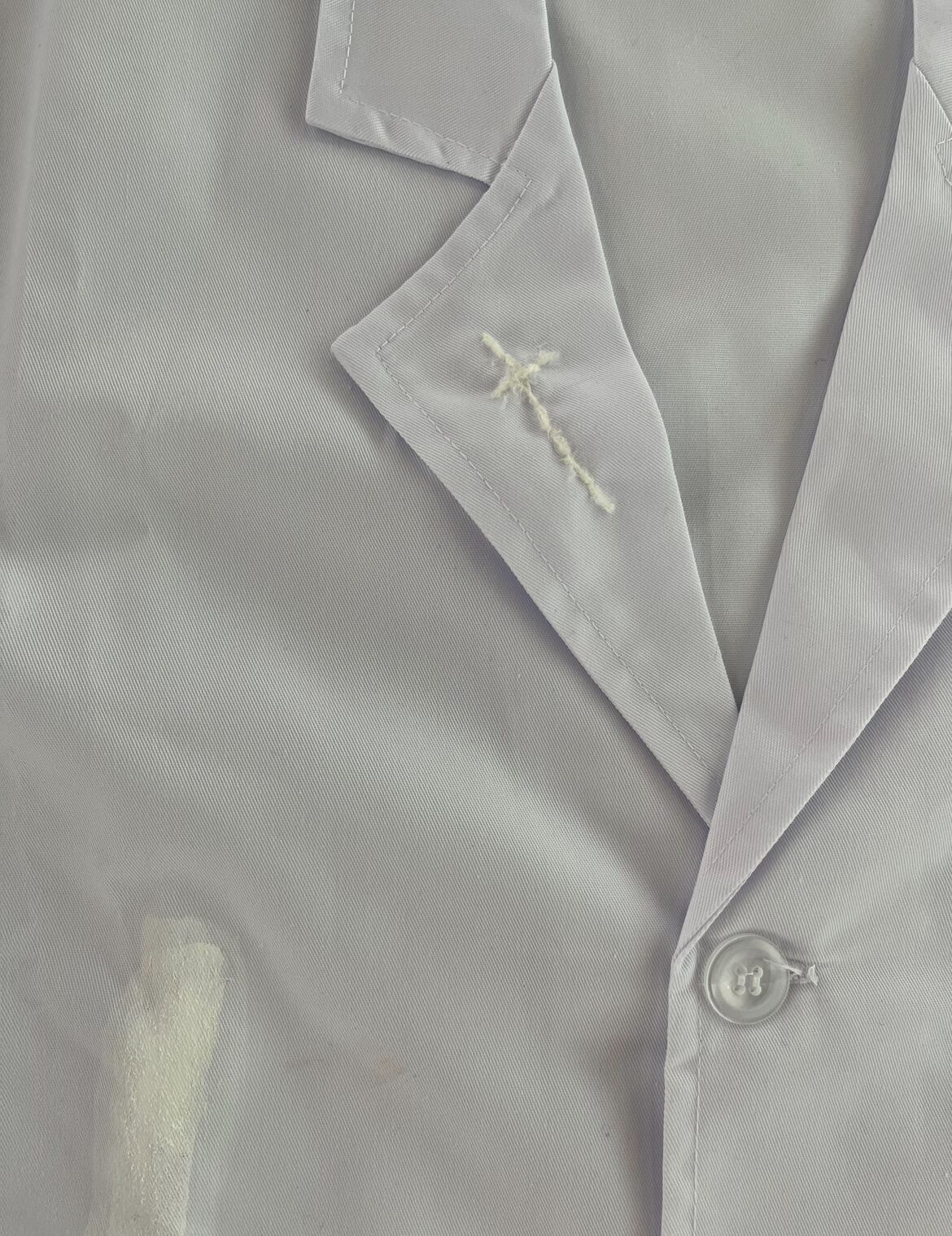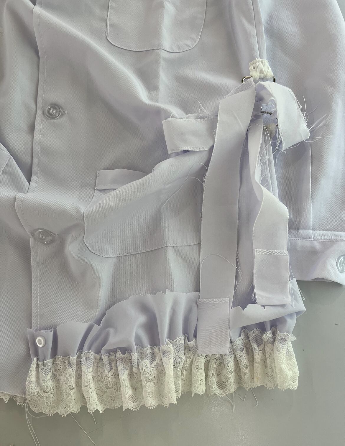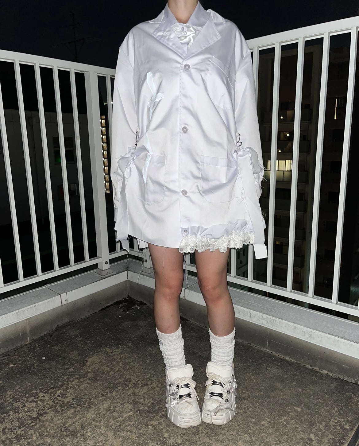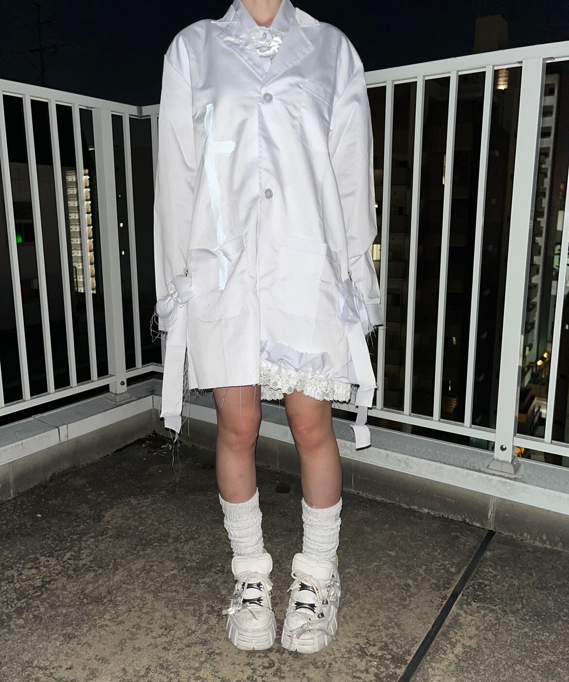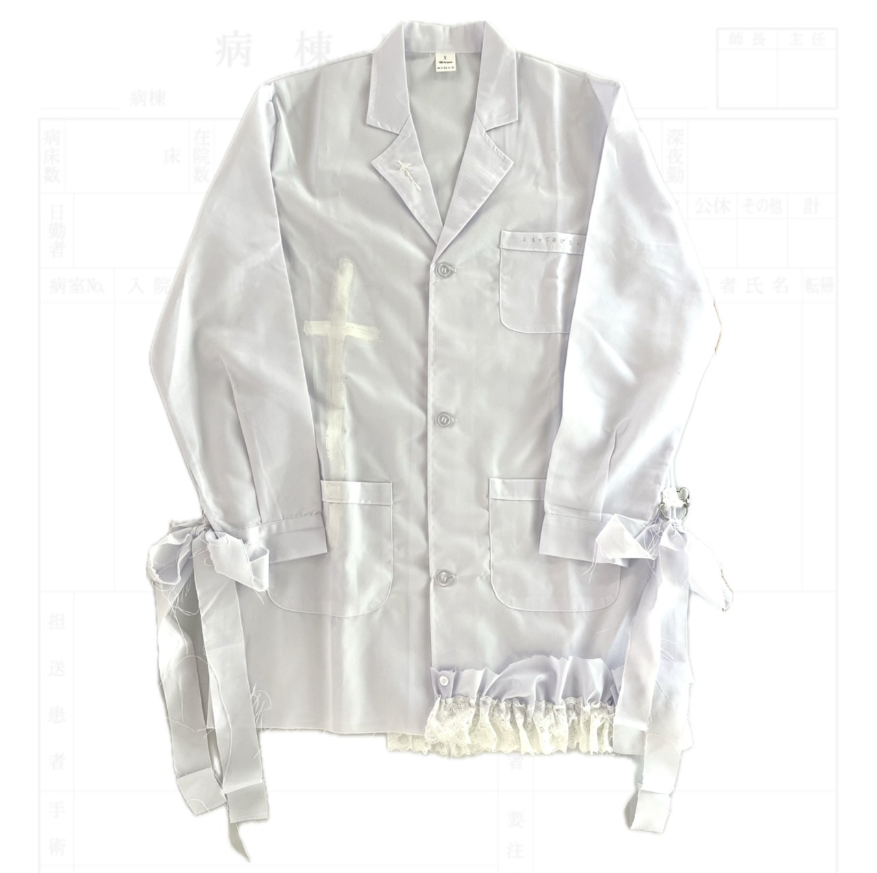 裾のレースや胸元ポケットのはんこ文字、十字架のペイントも可愛いです.
